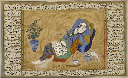 Mir Tuni, Dama dando de beber a un perro. Pintura sobre papel.Isfahan s. XVII